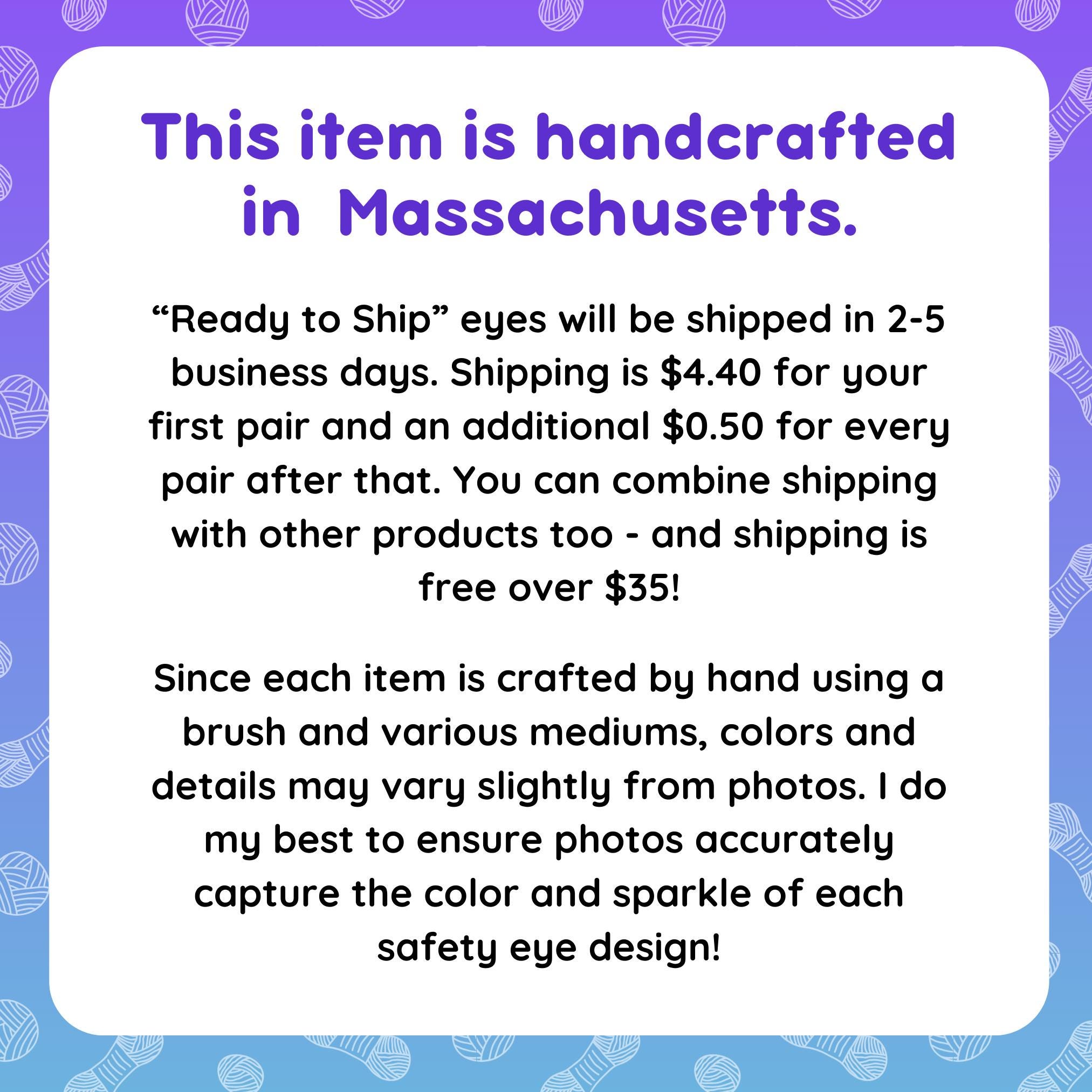 Please note that due to the handmade nature of this product, eyes may vary slightly in composition and coloring from photos. Eyes are individually hand-painted in a cat-friendly home in Massachusetts.