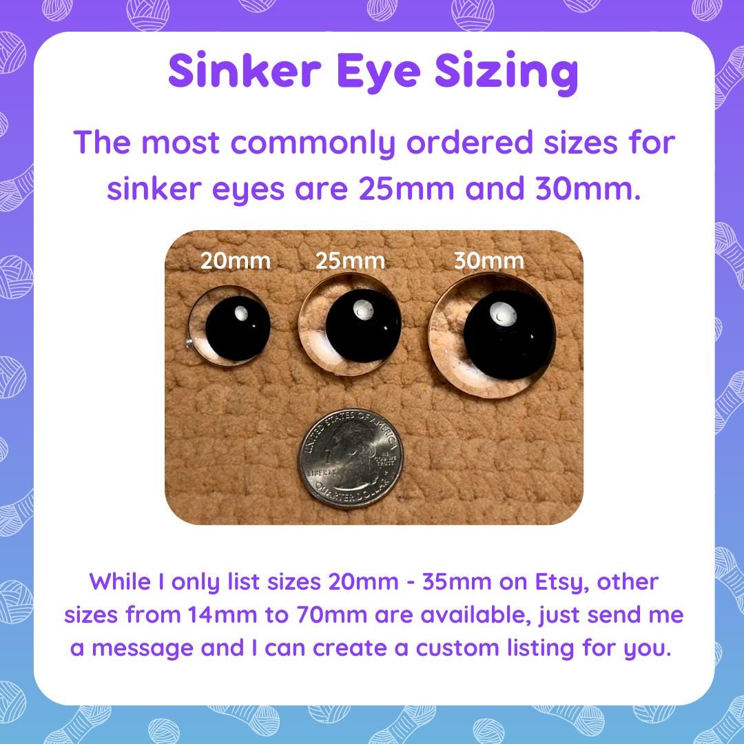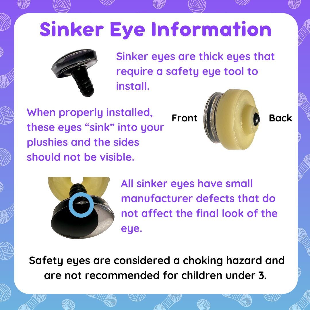 Sinker eyes: These eyes are designed to sit flush with your plush and require a safety eye tool or jig to install properly, especially when working with plush yarn. Many sellers on Etsy sell these tools. Attempting to install these eyes without one may result in damage to the eye.