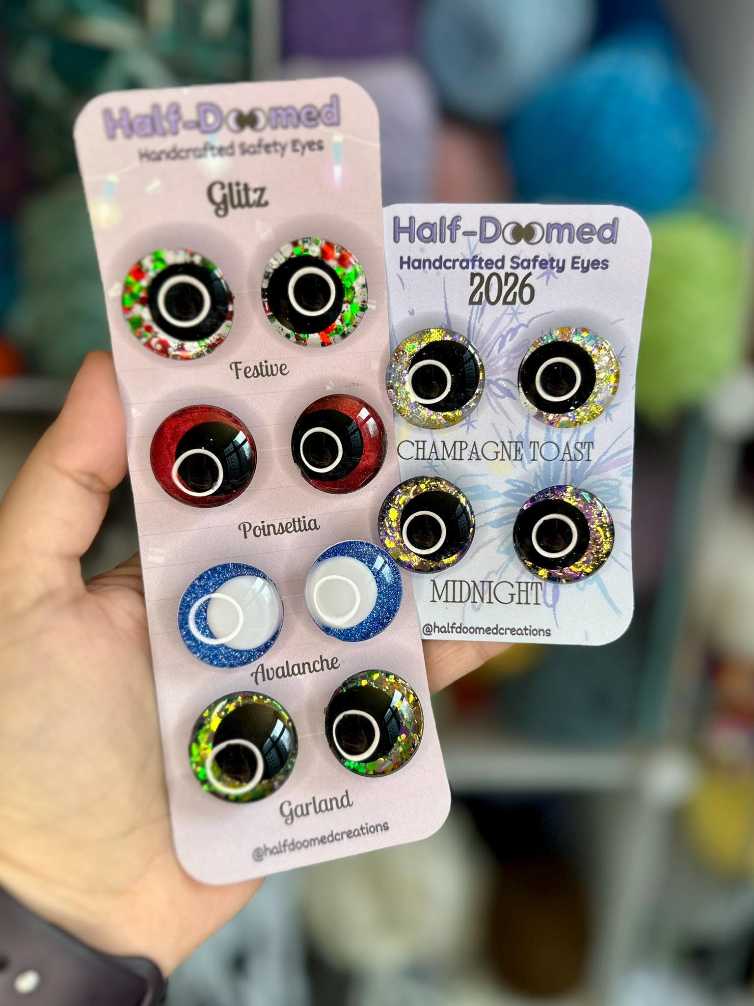 Gorgeous and sparkly, just like the season! Add an upgraded glitzy touch to your plushie or stuffed animal creation with a unique high-quality pair of kawaii safety eyes! This seasonal sparkle collection is available in 20-40mm kawaii eyes in black or white pupils. Designed by me and handcrafted to order, these fun safety eyes are sure to make you stand out at your holiday markets or in a gift basket. Choose between classic festive colors or glamorous New Year's Eve inspired eyes.