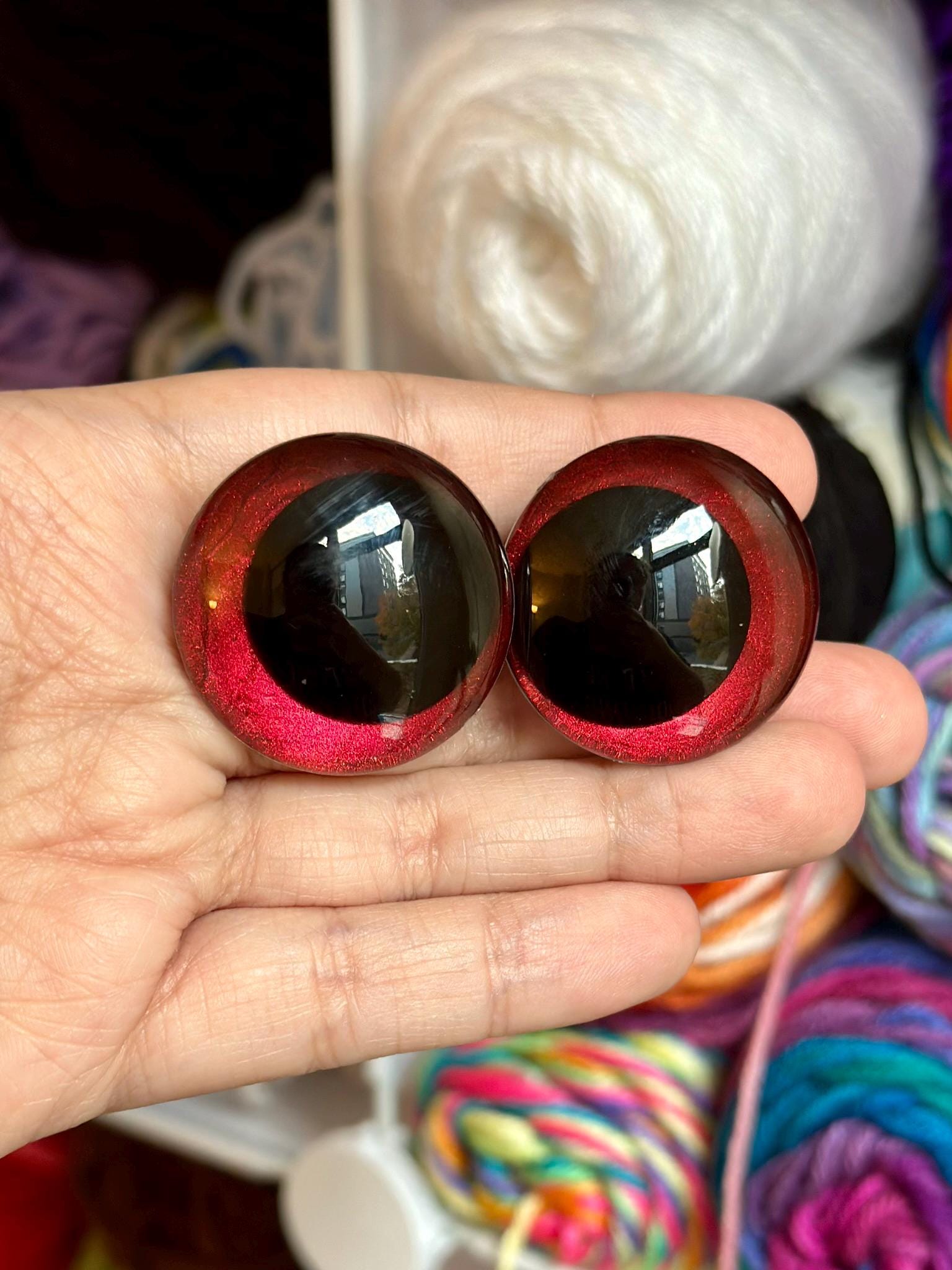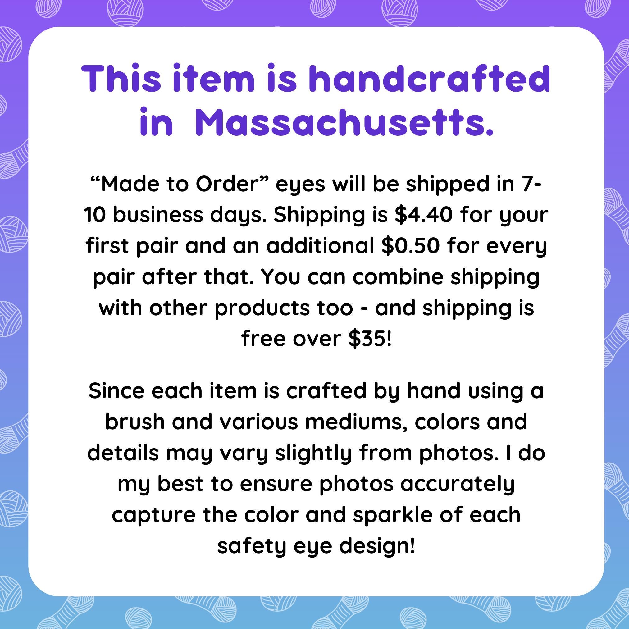 This listing is for one pair (2 eyes total) of handcrafted safety eyes designed by me with appropriate backings for each eye. These specialty eyes are handmade to order and they will be shipped 1-2 weeks from purchase. I do offer combined shipping - shipping is $4.40 for your first pair of eyes and $0.50 for every pair ordered after that. If you don't see the eye options you want, please contact me - custom eyes are available!
