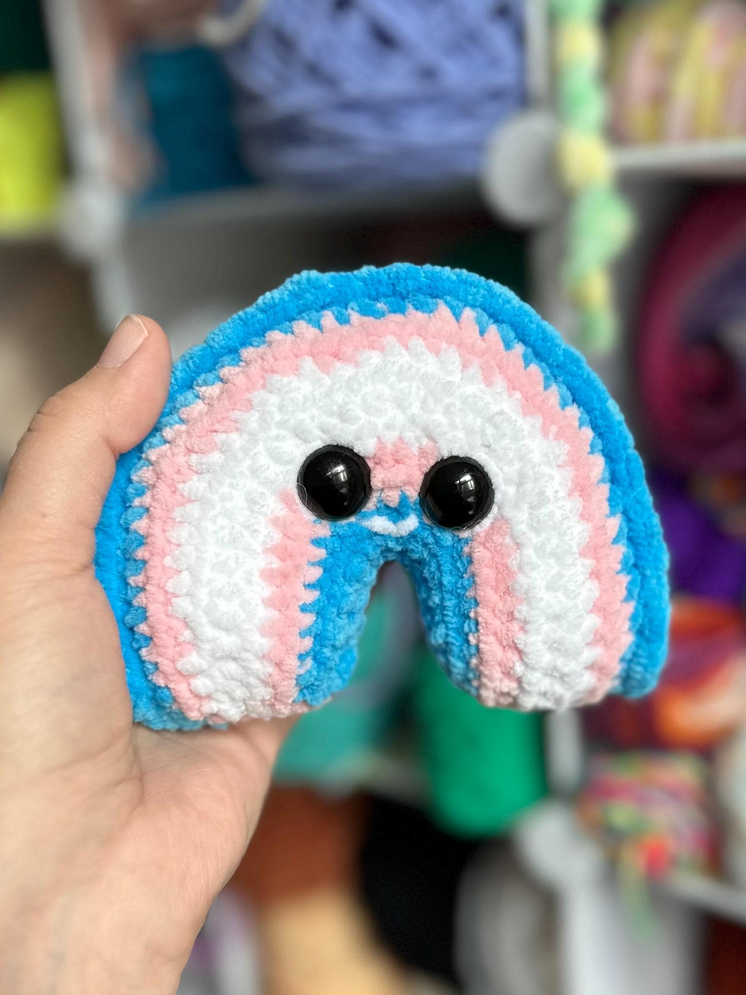 This mini rainbow plushie is sure to brighten anyone's day! Small and squishy, this rainbow is made of super soft chenille yarn with a little smile to make you smile. Perch it on a desk or shelf as a colorful and representative piece of home decor.
