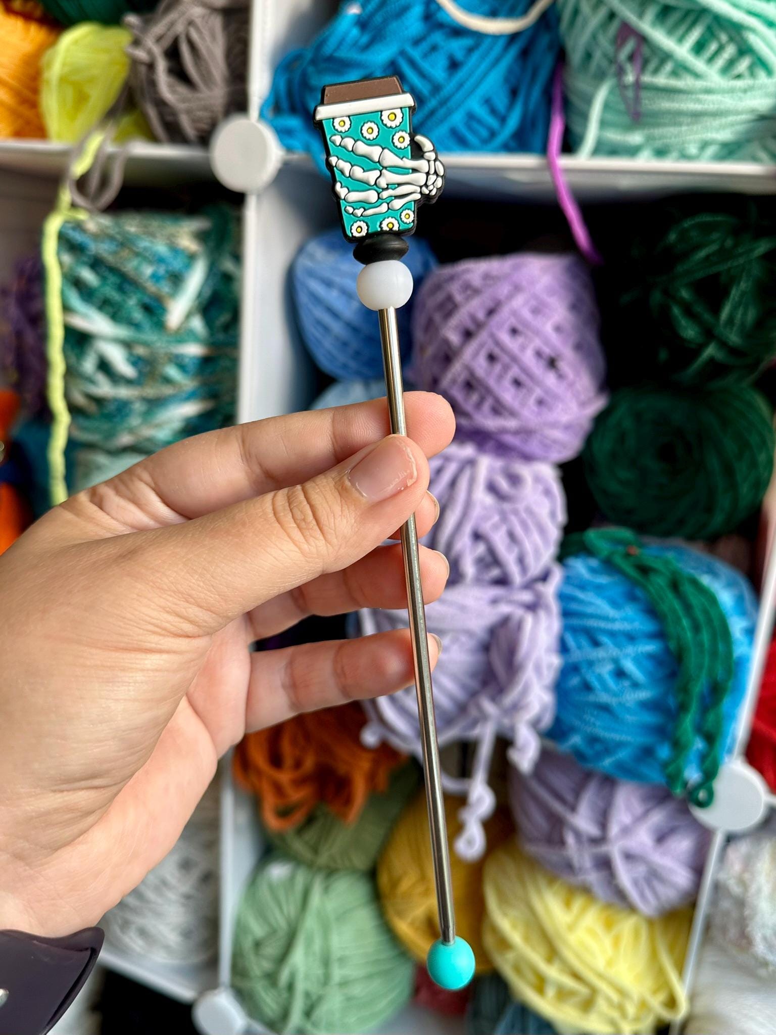 Caffeinated: Teal daisy coffee cup with skeleton hand topper with black and glow in the dark bead.