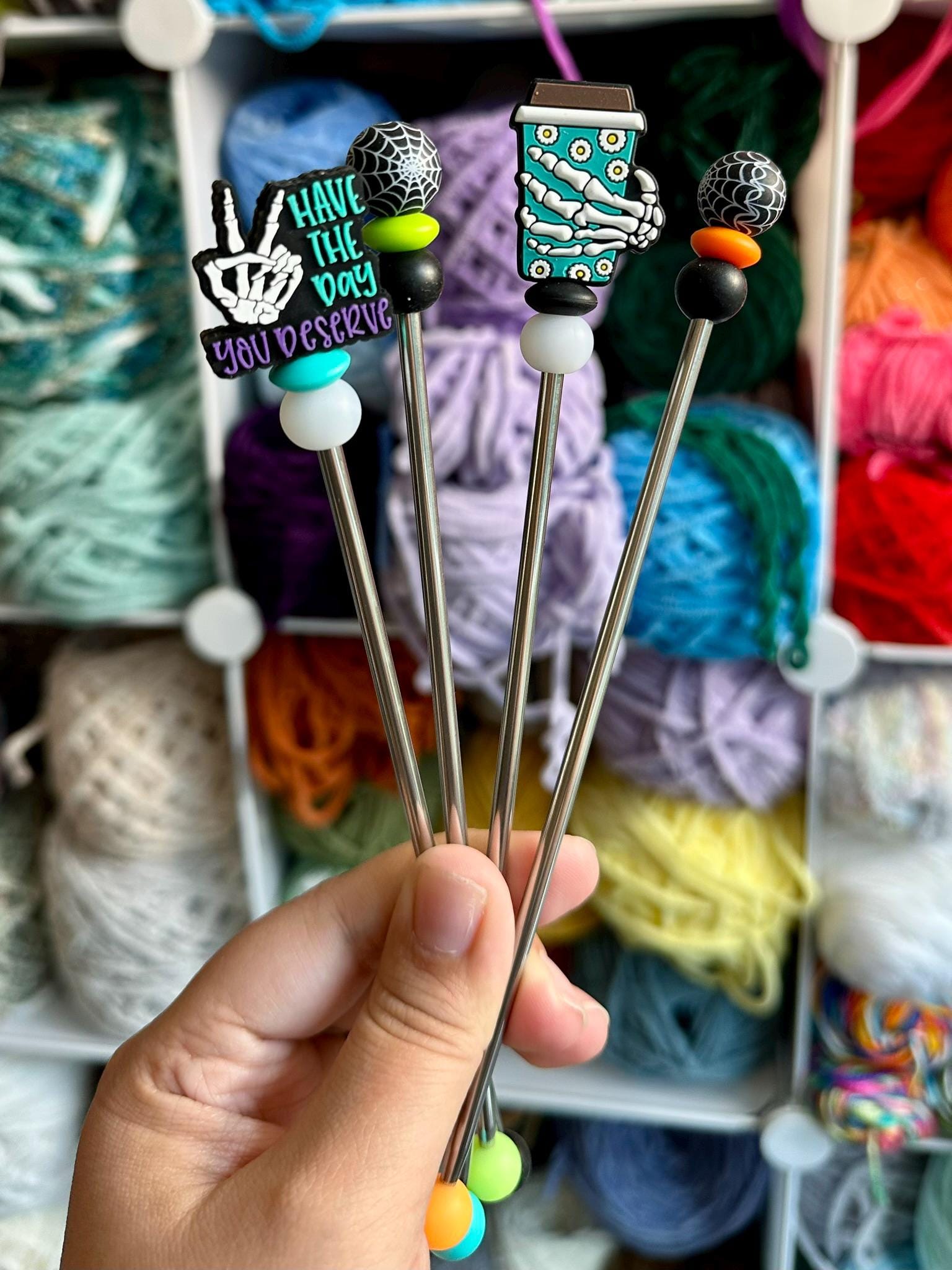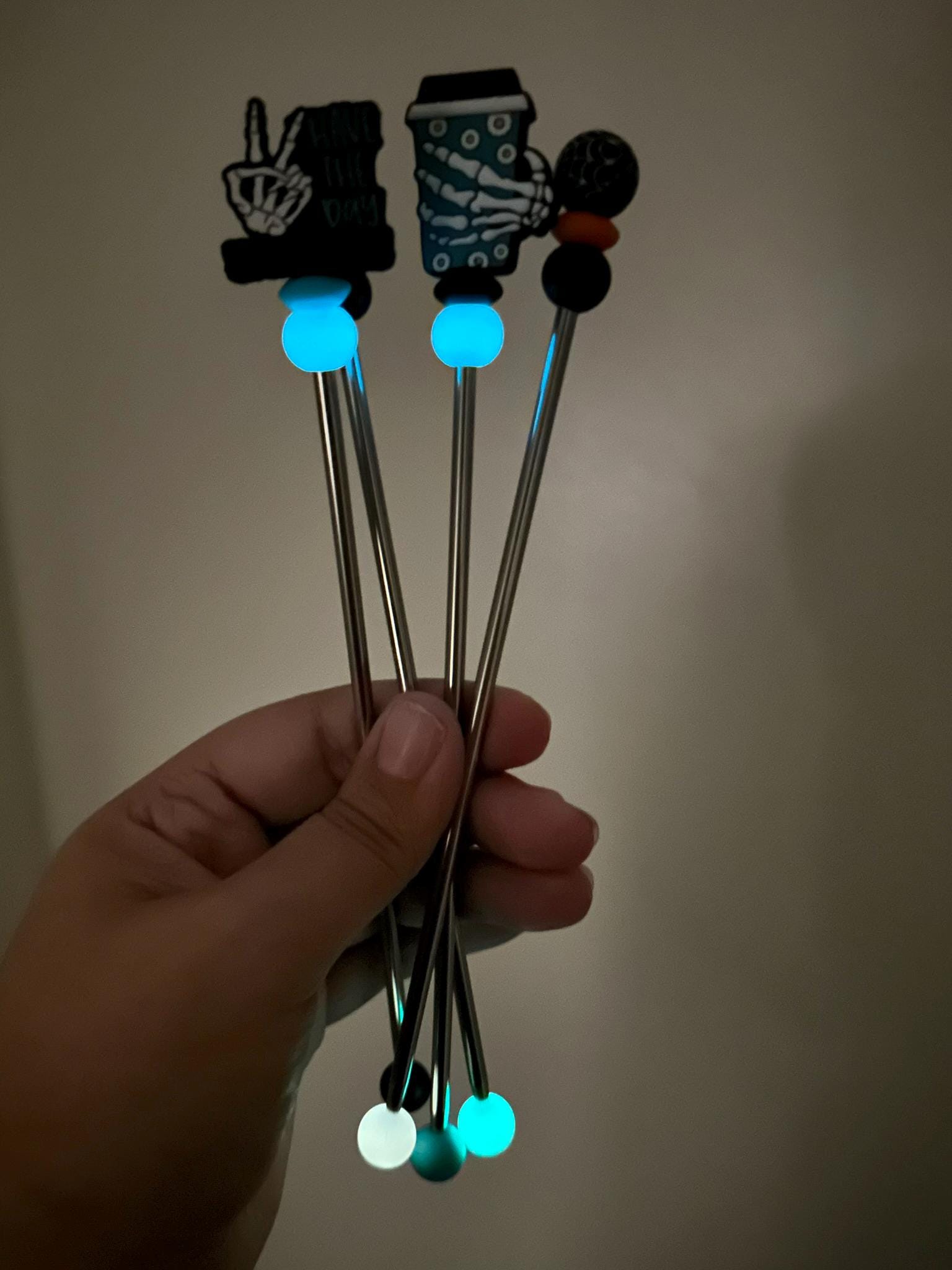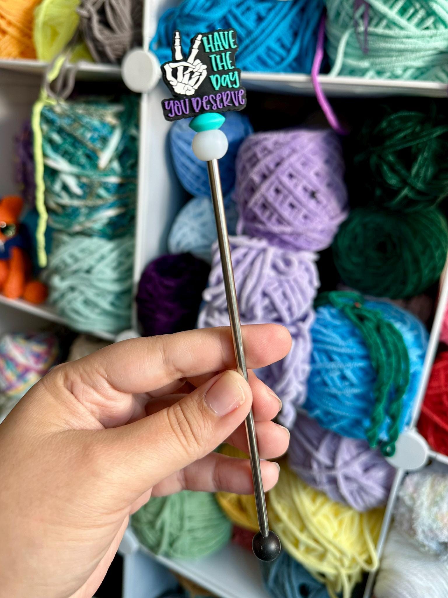 Deserve: Have The Day You Deserve skeleton topper with teal and glow in the dark bead.