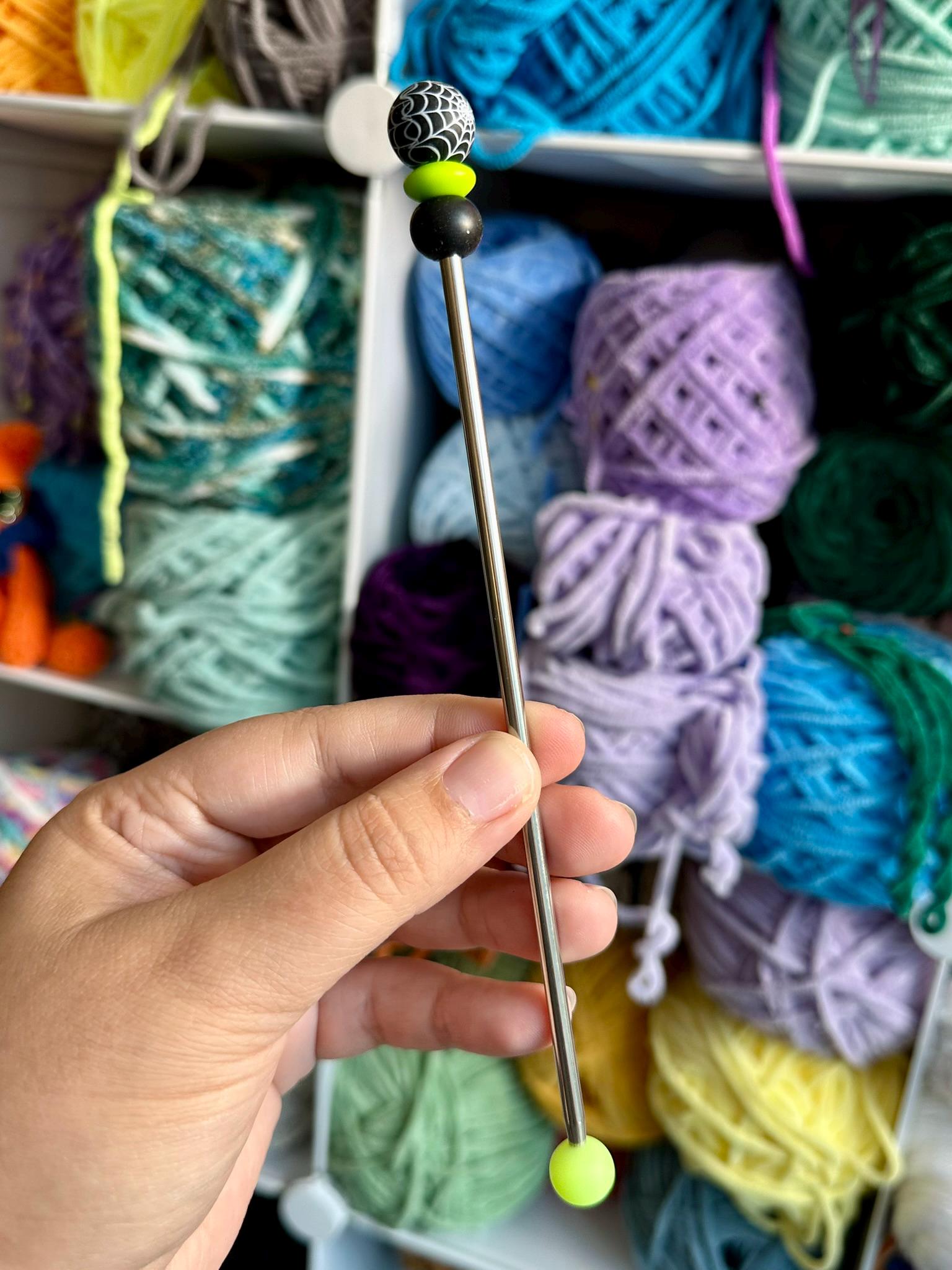 Cobwebs Green: Cobweb topper with lime green and black beads, bottom green bead glows in the dark.