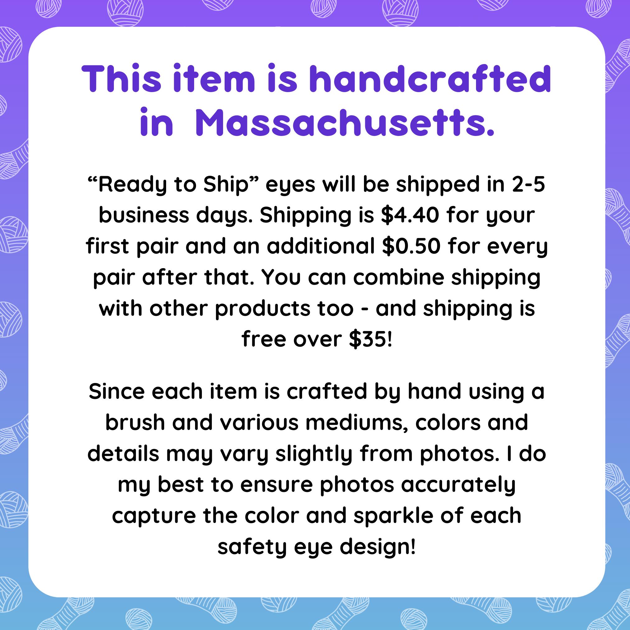 Please note that due to the handmade nature of this product and different display colors across device screens, eyes may vary slightly in composition and coloring from photos. These eyes are handpainted in a cat-friendly home in Massachusetts.