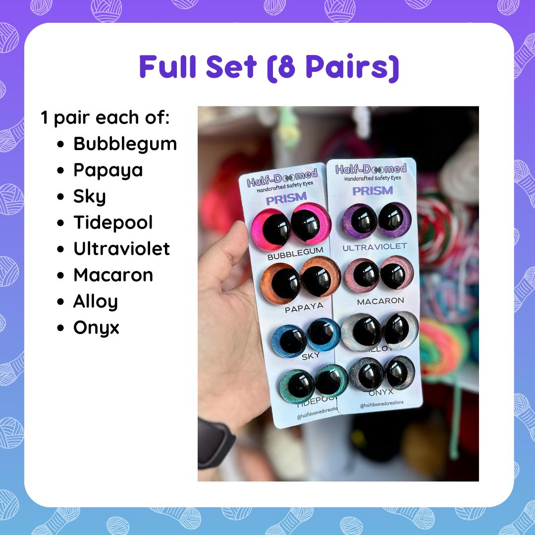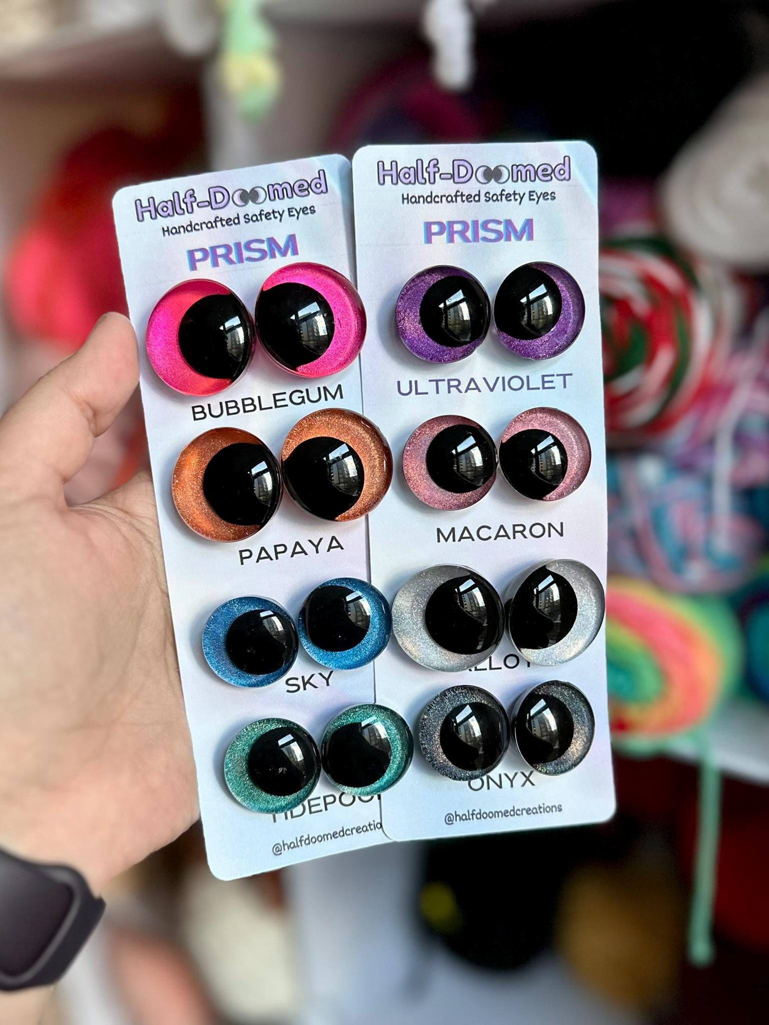 Introducing the Prism collection - my first permanent, ready to ship collection of handcrafted safety eyes! These beautiful holographic safety eyes reflect the colors of the rainbow in the light with a gorgeous shimmery colorshift. Set your plushies apart with a unique, high-quality pair of kawaii safety eyes! Since this collection is ready to ship, there are preset pupils and sizes, but any combination can be made as a custom order. All options are sinker style. Please be sure to look at all the photos - indoors, these eyes look like their shimmery base color, but once they're in direct light, they transform into rainbow colors!