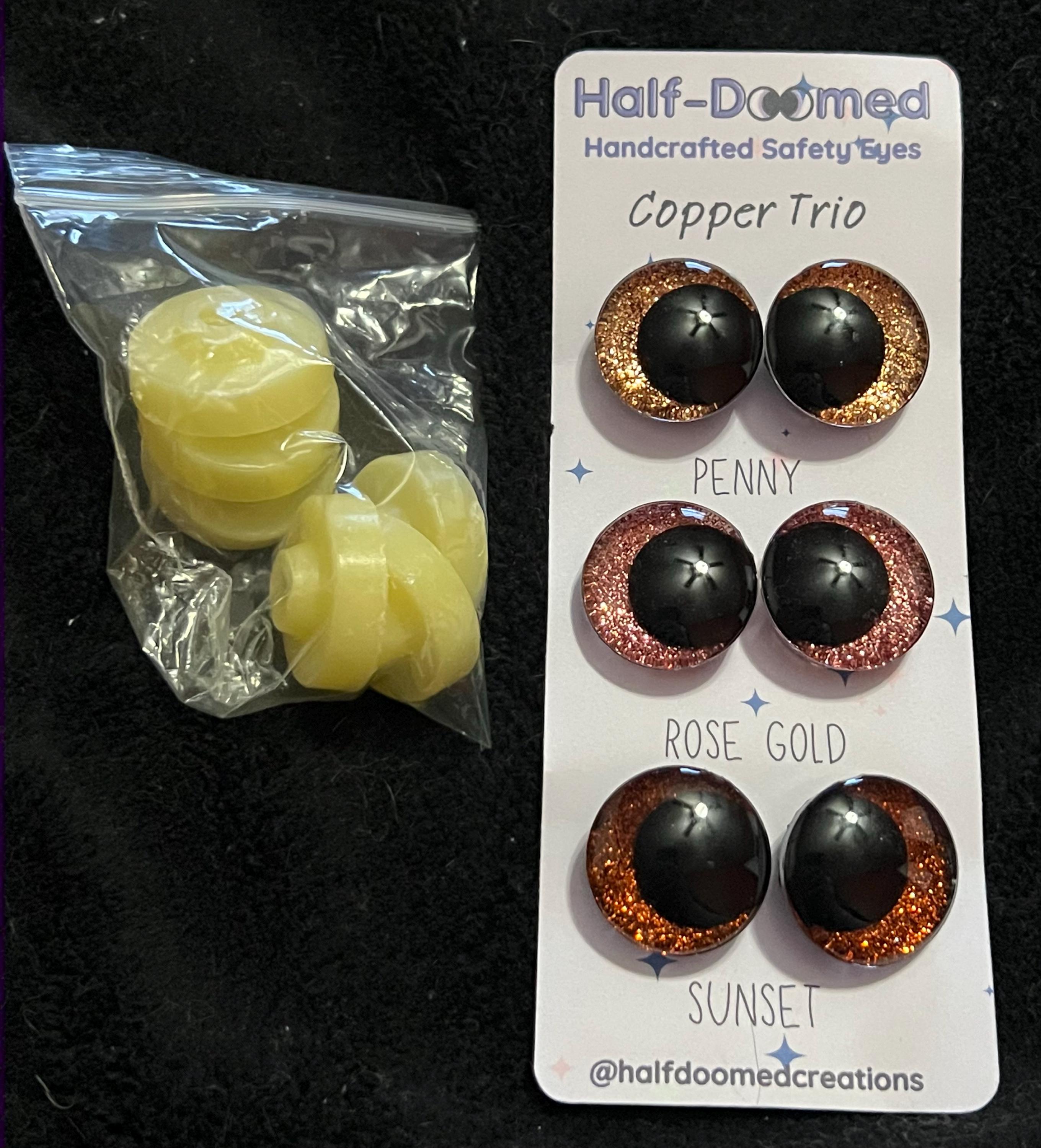 I have had some requests for smaller packs of safety eyes, so here are the Neutrals and Neutrals + collections combined into three monochrome trio options! Maybe you can't decide between my coppers, silvers or browns, so I made them available in packs of three with the whole spectrum. These realistic colors are great for everything from dragons to puppies. Set your plushies apart with a unique, high-quality pair of kawaii safety eyes! Please be sure to look at all the photos - I do my best to capture the sparkle!